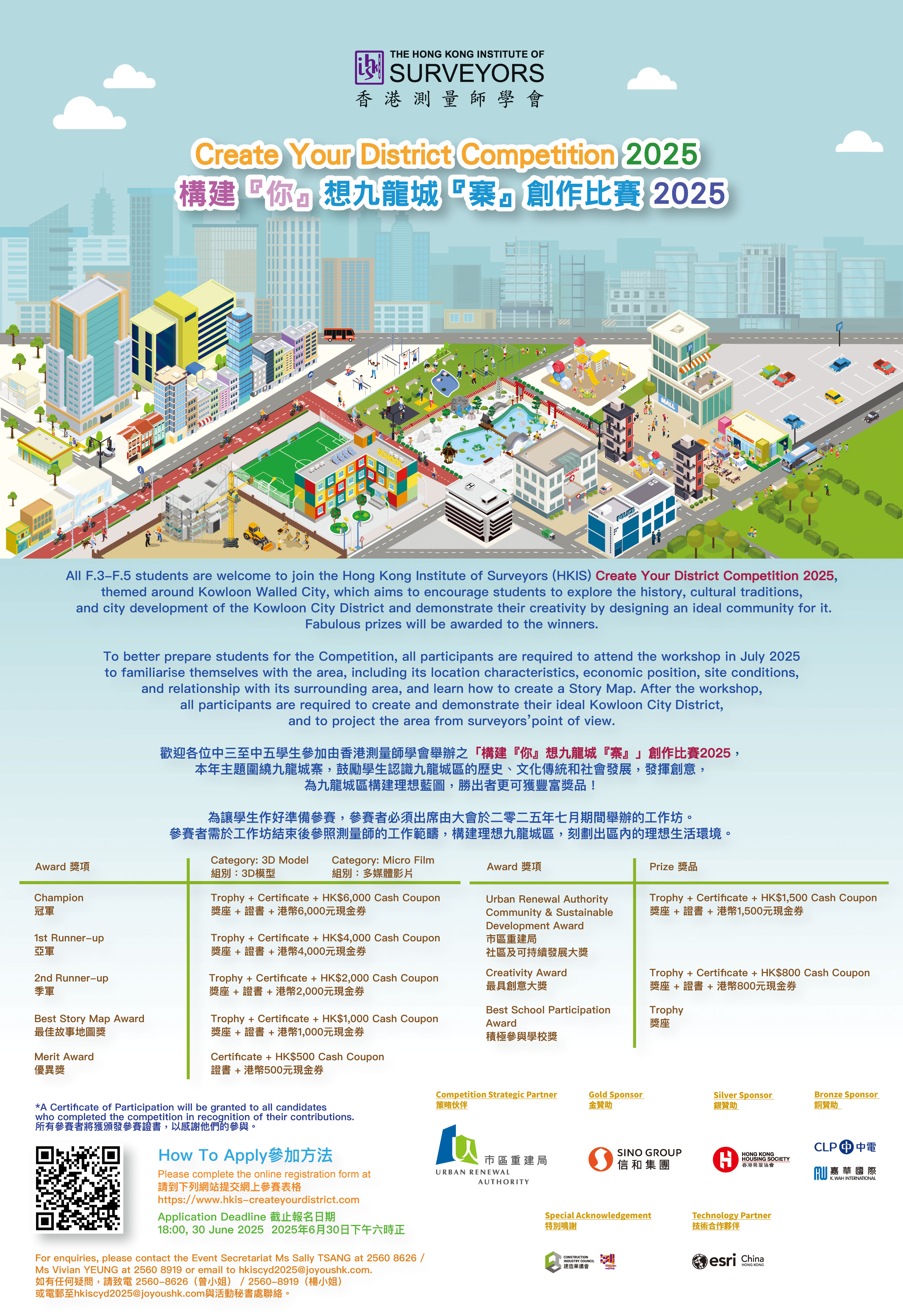 香港測量師學會舉辦之「構建『你』想九龍城『寨』」創作比賽2025,本年主題圍繞九龍城寨,鼓勵學生認識九龍城區的歷史、文化傳統和社會發展,發揮創意,為九龍城區構建理想藍圖,勝出者更可獲豐富獎品!